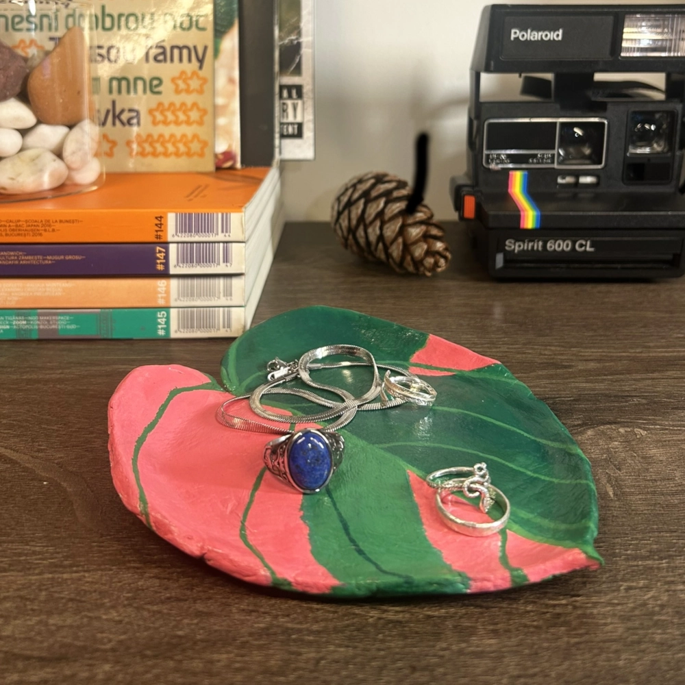 Această tavă de bijuterii handmade este perfectă pentru a-ți organiza și expune bijuteriile sau obiectele mici preferate. Forma sa delicată, inspirată de frunze de Philodendron Pink Princess, adaugă un strop de natură și eleganță oricărui colț al casei, fie pe noptieră, fie pe birou.